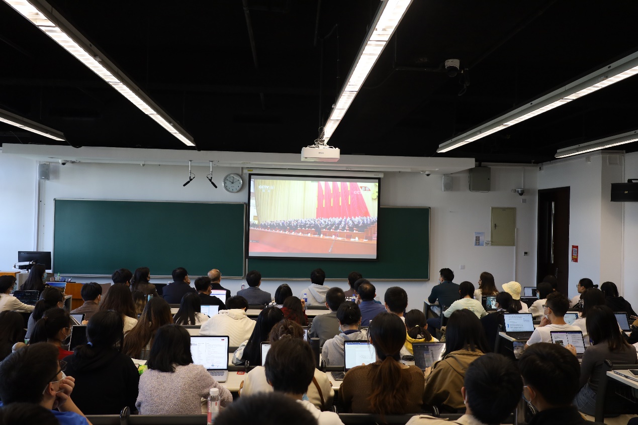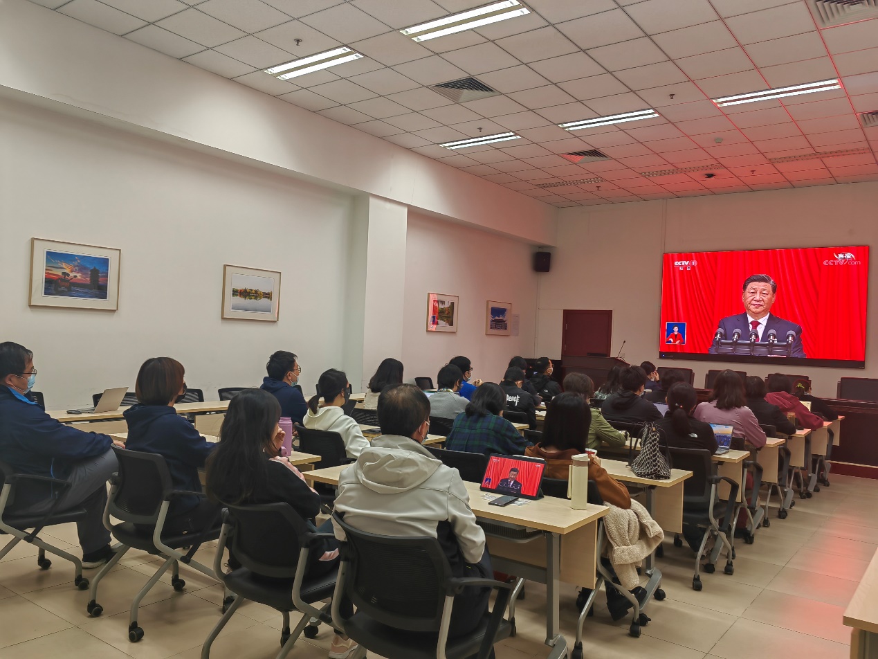 在做好疫情防控的前提下,根据学校党委的部署,全校党员和广大师生通过各种方式收看开幕会盛况。在校的校领导班子成员在办公楼103会议室收看开幕会直播。各基层党委(党工委、党总支、直属党支部)在各校区报告厅、会议室、教室集中收看。师生们认真聆听,不时热烈鼓掌。
