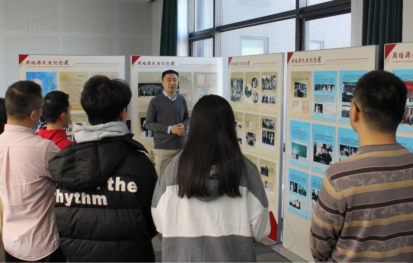 在周培源先生纪念展上,杨越向同学们介绍周培源先生的学术成就
