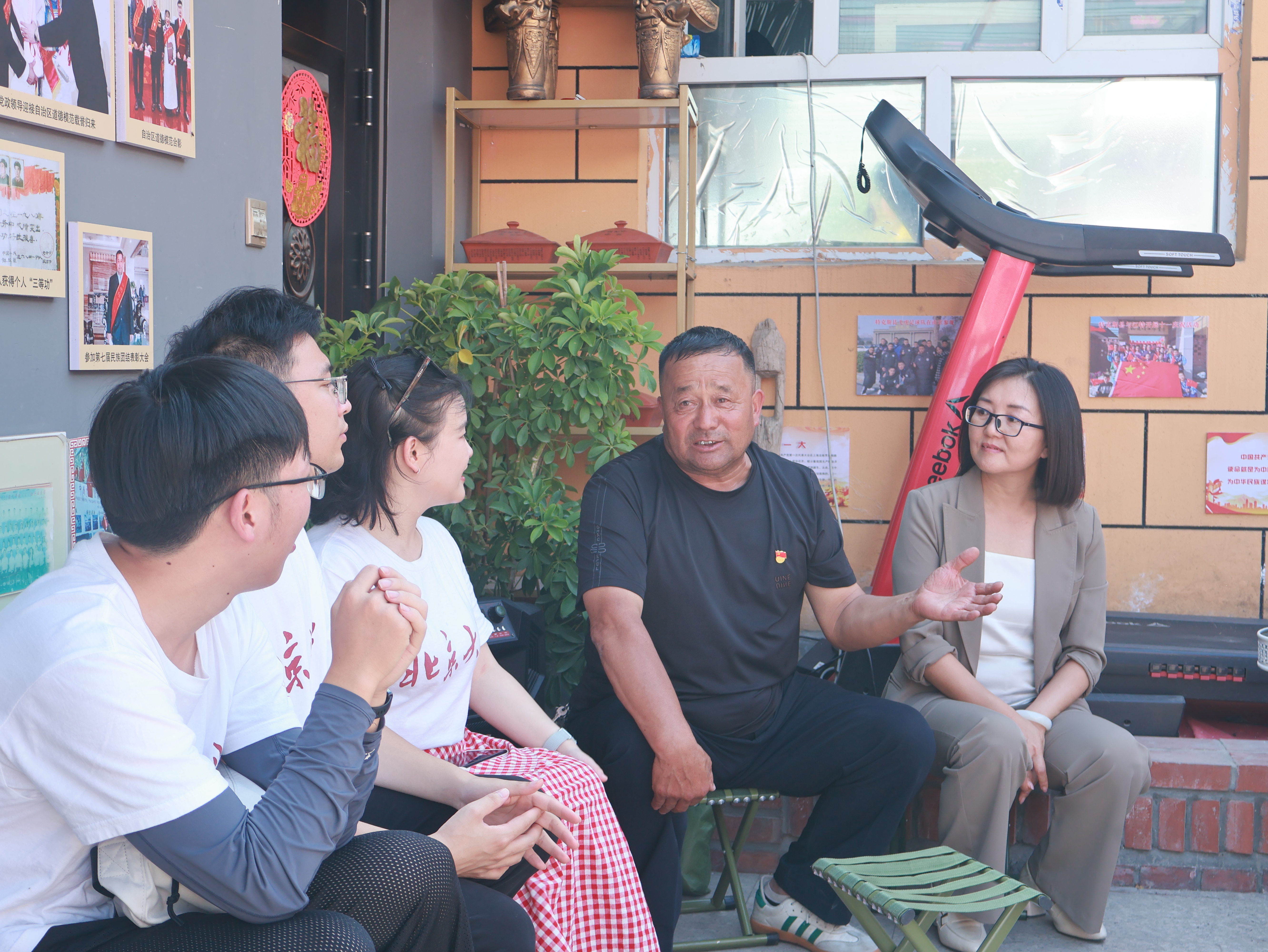 7月15日下午,实践团探访了沈建佳工作室。沈建佳是特克斯县退休干部, 30多年来资助了13个民族的176名贫困孩子。奎屯市第三中学七年级的马同学作为受助孩子代表,讲述了自己与“沈爸爸”的温暖故事。实践团硕士生徐本结合自身经历,分享了他从迷茫到坚定的成长之路。在温馨的小院子里,实践团与“沈爸爸”资助的各族孩子们举行了一场小型的联欢会,欢笑与掌声此起彼伏。