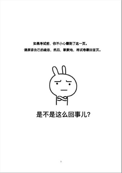 期末考试时,吴泽南会在试卷的前后封面写上寄语,放上可爱的表情包,“这样的设计其实很简单,但我和助教团队希望通过这一小设计,给同学们一点正面的激励。考试的时候总有人会先拿到卷子,拿到卷子后难免会提前翻阅。这是无法压抑的人性,怎么办?我希望在试卷的编制和排版中加入一些小细节,让打算提前翻阅的学生笑着翻回去。这是我能做的,相比苦口婆心的劝说和提醒,在考场中让师生进入一种‘敌对’的状态,不如换一个方式处理问题,从他们的角度去思考和设计试卷。”