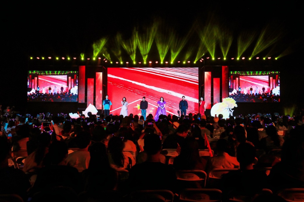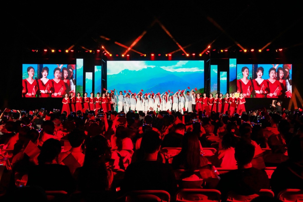 十佳歌手联袂献唱的《我爱你中国》向祖国送出最深情的告白,用歌声献礼祖国华诞。大屏幕上一幅幅中国壮丽风光、建设成就和人民幸福生活的影像徐徐展开,与歌声交织成一曲动人的视听交响。 “我爱你中国,心爱的母亲”唱响时,全场观众深受感染,情不自禁地起身挥动手中的国旗,一同加入合唱。霎时间,草坪化为一片涌动的红色海洋,激昂的歌声与澎湃的激情交织,将晚会现场化作一堂生动而深刻的爱国主义课堂。