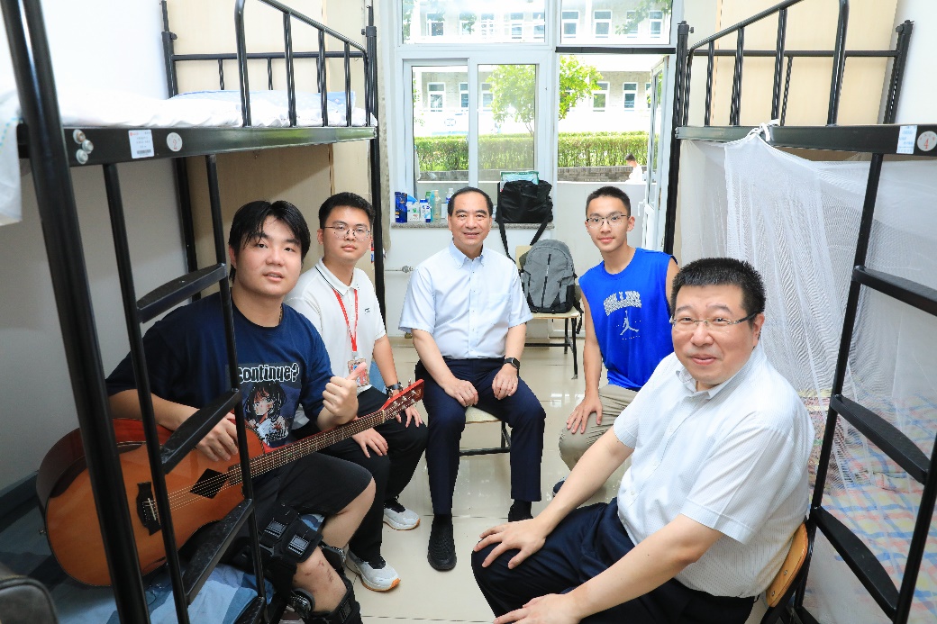 在43楼及44楼学生宿舍,校领导与新生亲切交流,了解学生宿舍的使用情况,仔细询问新生对住宿条件的感受,鼓励他们尽快融入北大的学习生活,努力学习、报效祖国。校领导向新生代表赠送了书籍、体育用品等迎新纪念品。