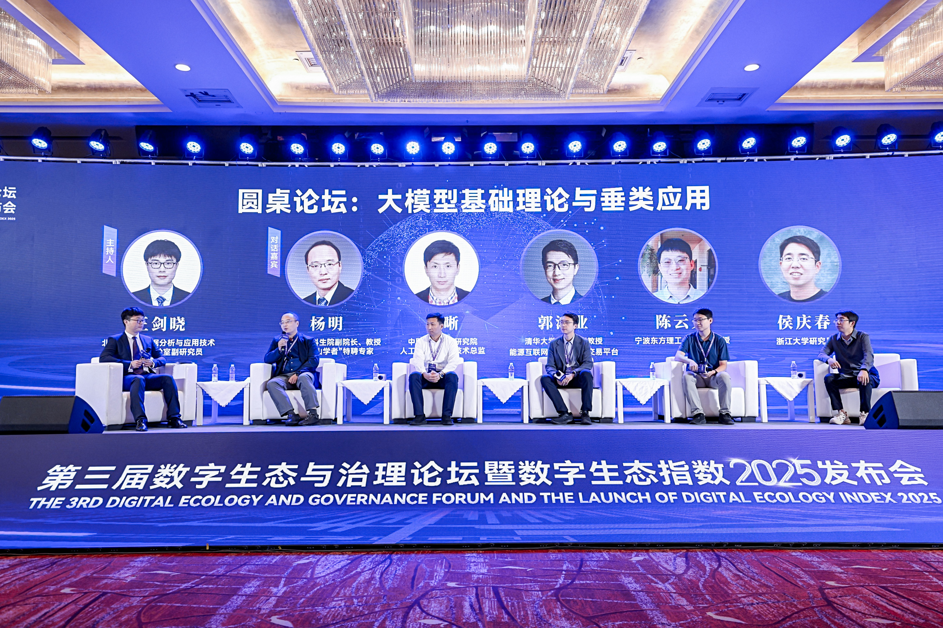圆桌论坛环节,山东大学本科生院副院长、教授杨明,中国电力科学研究院人工智能研究所技术总监陈晰,清华大学电机系副教授郭鸿业,宁波东方理工大学助理教授陈云天,浙江大学研究员侯庆春围绕“大模型基础理论与垂类应用”主题展开探讨。圆桌论坛由实验室副研究员王剑晓主持。