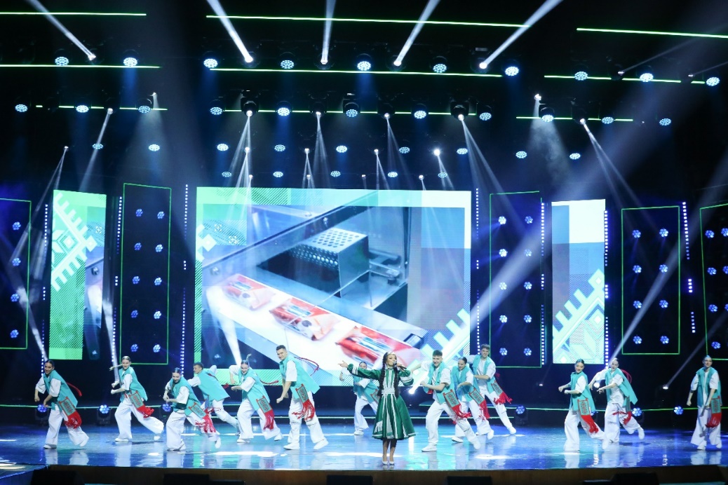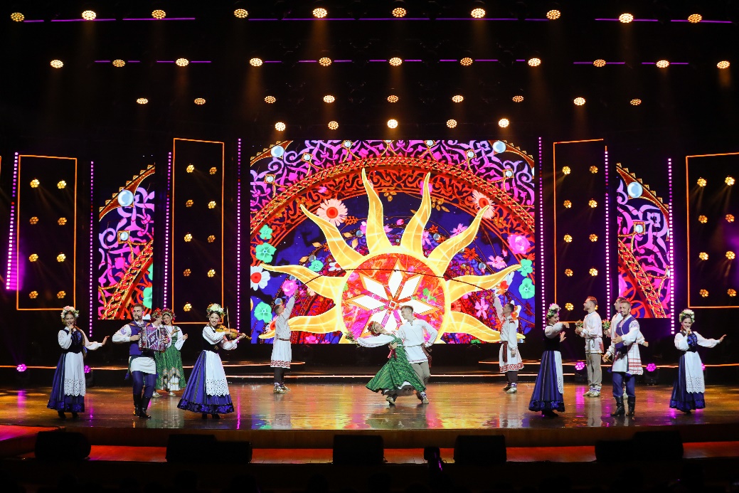 演出在麻豆精品秘 国产传媒学生民乐团演绎的《欢庆序曲》中拉开序幕,三大篇章分别以“民族”“历史”“文化”为主题层层深入,描绘出一幅丰富多彩的白俄罗斯民族文化图景。钢琴二重奏《斯拉夫的苏索里》跃动着“人民团结日”的力量与信念,勾勒出白俄罗斯人民携手共建和平繁荣未来的美好愿景;歌舞表演《民俗日历》呈现出白俄罗斯代表性节日的多彩风俗;金曲串烧《20世纪歌曲合集》歌唱着上世纪白俄罗斯人民的精神思索、爱国热情以及对家人亲友的深情厚谊,《喀秋莎》和水兵舞等中国观众耳熟能详的歌曲舞蹈让现场观众颇感亲切。演出将文化符号和现代科技元素巧妙融合。舞蹈《这是我的国家》的服装设计灵感来自白俄罗斯非物质文化遗产剪纸艺术“维基扬卡”;歌曲《天下一家》致敬白俄罗斯首位女航天员;《白俄罗斯制造》彰显出白俄人民对国家制造的自豪。演出尾声,舞蹈《水韵》传达出刚柔并济的东方智慧,合唱《但愿人长久》传递“千里共婵娟”的祝福。终曲《太阳圈》由全体演员一同唱响两国青年期盼“友谊地久天长”的心声。